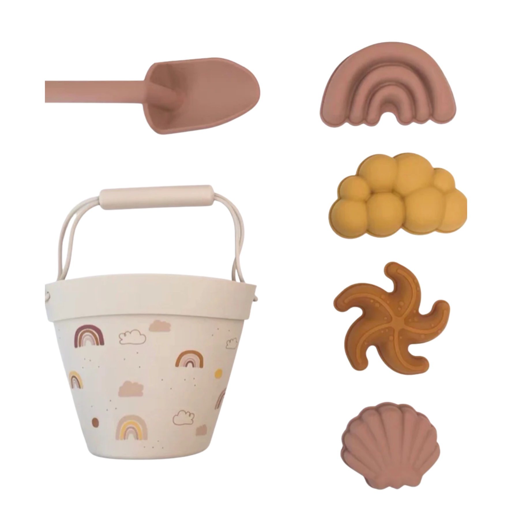 Cubo suave, palita y moldes en tonos mediterráneos: perfectos para jugar en la arena, hacer figuritas y disfrutar de la playa con estilo.